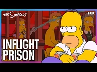 In the prison, they spray people who were acting increasingly erratic, and a riot ensued as they attempted to break out. Homer sends a text message to Marge to inform her of the situation. At that moment, Maggie reaches her bed in the first-class section, takes the phone, and replies to him. Homer notices that Marge is replying, but it's Maggie and interprets Maggie's emojis as a message telling him to stop complaining and act bravely. Homer announces to other passengers that they must start acting civilized with eggplants. As the handcuff sign turned off, all passengers were freed from prison and returning to their seat. The flight attendant wakes Marge up as they're preparing to land, and she realizes she had slept through the entire flight.