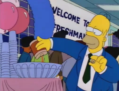 In "Homer Goes to College", Homer spikes the punch at a college dance with alcohol. Also in "The Springfield Connection", When Officer Marge catches Homer for illegal parking, Homer states his intention was to buy beer for Dolph, Jimbo & Kearney.