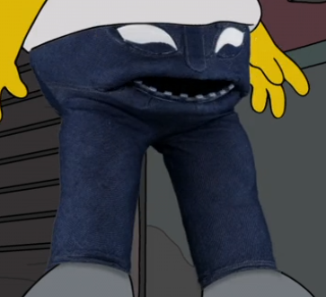 Denim arrived on Earth in search of a host and entered the dressing room at The Generous Cut. When Homer is having trouble fitting new pants that he liked, he'll try to put on Denim. Having purchased the pants, Homer heads to Irv's Non-Canonical Diner, hoping to get a date with Marge. Yet, as he met the courage to approach her, Snake tried to rob the diner. Denim took Homer's legs, kicking his gun away and strangling Snake with his legs until he passed out. As the police approached, Denim decided to run to get away from the police. Fleeing into an alley, Denim revealed that he originated from Wrang-lor, a planet devastated by acid rain. Denim had fled to Earth and chose Homer as his host for his substantial "undercarriage" and the sustaining "methane emissions." Denim promised Homer that he could assist him in achieving his greatest desire in the world.