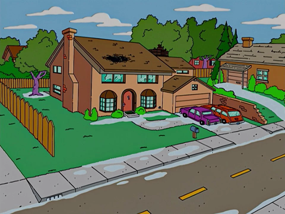 When the family (except Homer) arrive at the Calmwood Mental Hospital to check on Homer, there is no building in front of it. But when the Simpson family, Ned and Dr. Hibbert visit Homer in his patient room, the Flanders house is in front of it with Ray on the roof, as seen in the patient room window. The Flanders house might've been so far away from the mental hospital that the house can be seen from the hospital.