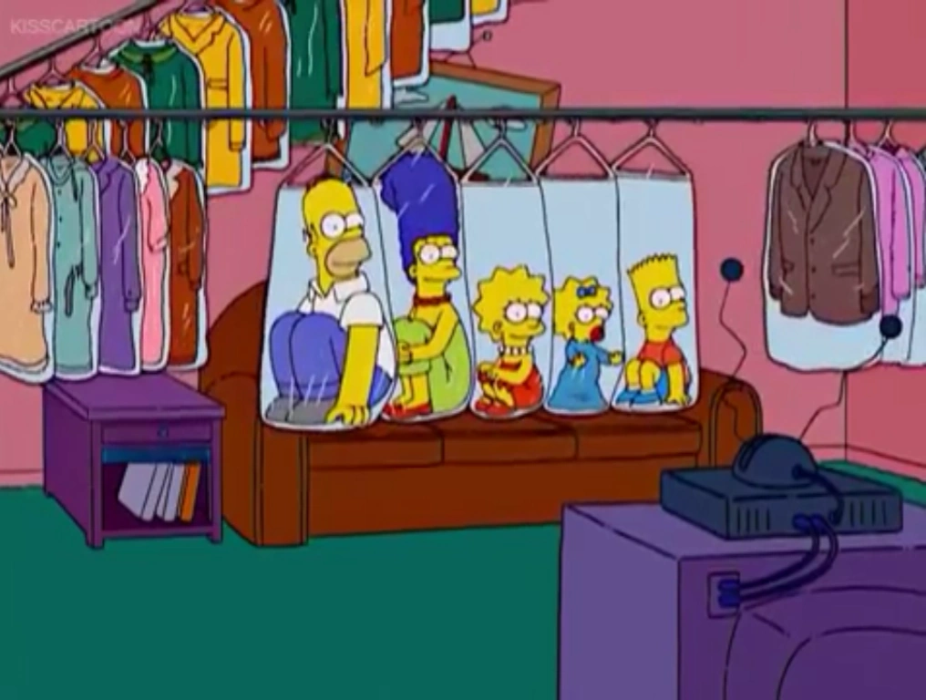 A clothes line is above the couch, with a bunch of shirts and jackets hanging on it. The conveyor belt then scrolls through all the clothes, until The Simpsons appear in plastic bags, hanging over the couch. Maggie then gives her passy a suck.