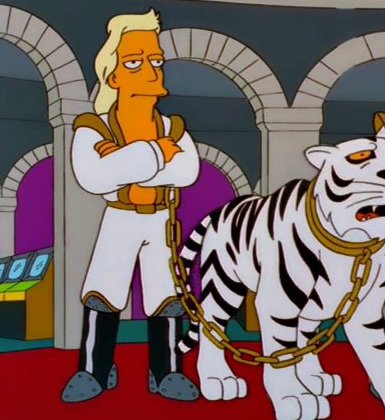 Gunter and Ernst are a parody of Siegfried and Roy, with whom they share several similarities. In a case of fact following fiction, the 1993 episode “$pringfield” depicts the duo being savagely mauled by their trademark white tiger, Anastasia. Ten years later, on October 3, 2003, the trained white tiger Montecore dragged Roy Horn offstage by his neck during a performance at The Mirage, severely injuring Horn.