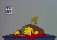 As the FOX censor talks, the rating icon stabs him with a cutlass (originally, a dagger, but the real-life FOX censors objected) repeatedly, worsening the rating each time, from TV-G to TV-PG, then TV-14, then TV-MA, then TV-21, and finally TV-666 (the number of the Devil). He finally dies as his blood spells out the episode's title.
