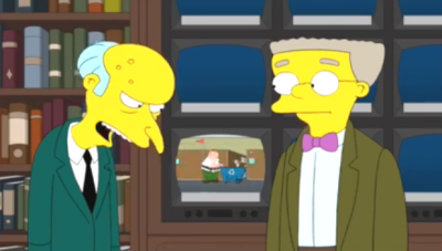 In "Pawtucket Pete", Mr. Burns and Smithers watched Peter Griffin on TV, working at Pawtucket Brewery. Mr. Burns thought that he was an employee at the nuclear power plant, but Smithers corrected him that he came from a different company. He did, however, admit that Peter Griffin was basically the same thing as Homer Simpson. |