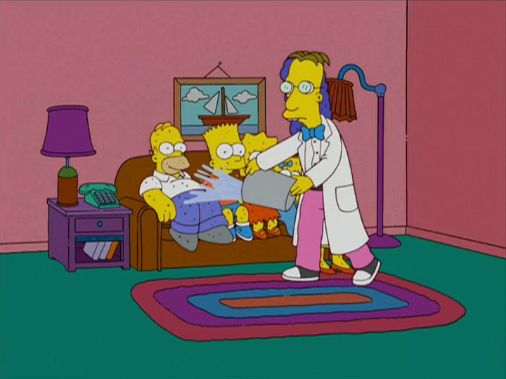 The Simpson family are already seated on the couch, but appear as small pills. Professor Frink appears and puts drops of water on them and they all grow to their normal size, except Homer, who needs a bucket of water.