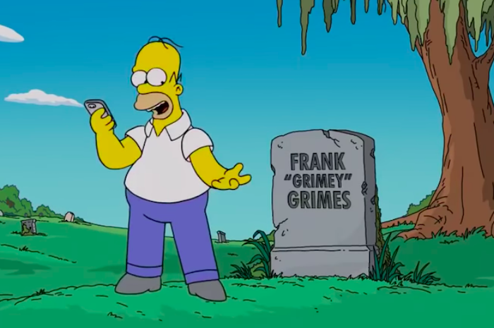 - His gravestone has been shown with several different inscriptions: Grimes ("Homer's Enemy"), Frank "Grimey" Grimes ("Alone Again, Natura-Diddily" and "My Mother the Carjacker"), Frank Grimes (Homer's enemy) ("The Great Louse Detective"), and Frank Grimes ("Treehouse of Horror XXII").