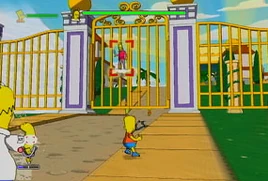 The Simpsons meet old enemies: the lumbermen from "Lisa the Tree Hugger" and the Rigellian aliens from "Invasion of the Yokel-Snatchers", all with halos on their heads. After beating them all, they get to a huge hole in the middle of the Heaven. The two paths on each side are closed, so they have to cross it. There are hundreds of clouds on the bottom and small clouds floating on it. Lisa uses the Buddha's Hand to place Elvis' golf grass on the clouds so Bart can grapple to the other side and pull the lever that opens the locked paths. Now, they are in a big steam baths building, with more aliens at the entrance. Homer, as Homer Ball, boosts inside and opens the door. The dolphins from "The Day of the Dolphin" come from little pools inside. Lisa uses the Buddha's Hand freeze power to freeze a dolphin and place the ice block on some burning coals, making steam coming from it. Bart, as Bartman, floats on the steam and jumps on the roof. Homer does the same as "Heli-Homer". They both step on two pressure pads to open the door and allow Marge and Lisa to rejoin them.