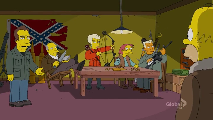 When Springfield began installing surveillance cameras around Springfield and 742 Evergreen Terrace is discovered to be a blind spot, the Simpsons' backyard is transformed into a gathering place for rebellious activity. During the daytime chaos, Superintendent Chalmers swings a pair of nun-chucks while prancing in a frilly dress. Upon being spotted by Ned and Homer, he stops and reacts with shame, explaining, "This used to be just a little part of me."[40]