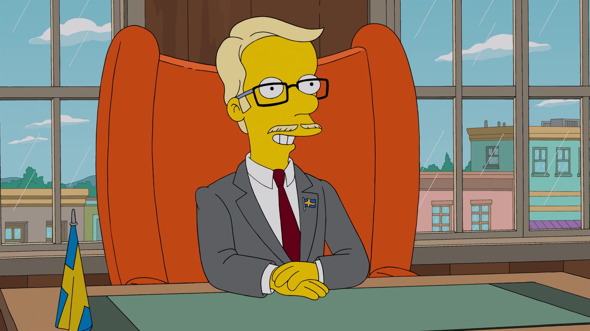At some point in his life, he moved to Springfield and became a movie producer. He believes that all movies should be free to see, so he is fine with Homer pirating a movie (although if in Sweden it is legal to pirate a movie (at least according to him) but, not in the USA and Homer isn't Swedish but American he should be arrested for piracy). When the F.B.I. found them, he liked the rock music that the F.B.I. used, because it reminded him of death. It is unknown why he likes death though. The song was about respecting the copyright law (because Homer was disrespecting it) and the purpose of it was to force Homer to get out of the building and get arrested. At first Homer didn't want to go but after Marge admitted that it was her who snitched Homer he decided to give up to them.