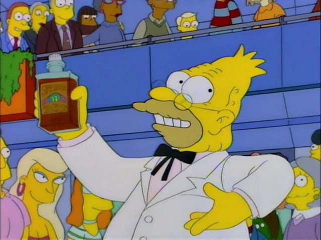 The "X-Files-style" music also plays when Bart peers through his telescope at the adults (Revitalizing Tonic customers) arriving at their houses, hurrying inside, and closing the curtains.