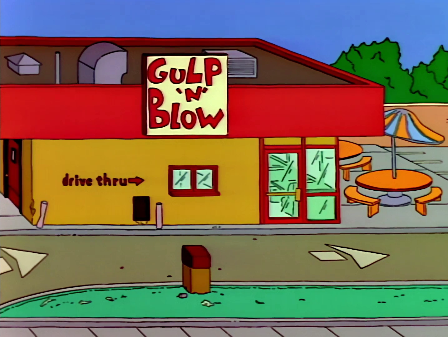 Gulp 'n' Blow (styled as Gulp 'N' Blow ) is a fast food restaurant in Springfield that also offers drive-thru service. Among the items on their menu are tacos and onion rings.