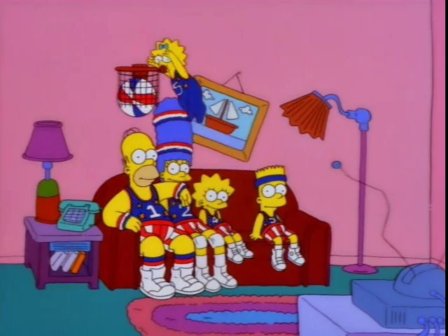 The family comes in, dressed as the Harlem Globetrotters, passing a basketball to each other while Sweet Georgia Brown plays. Maggie dunks the ball into the basket above the couch, hitting Homer on the head.