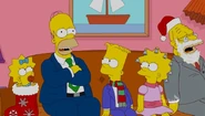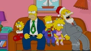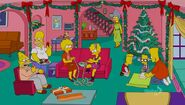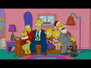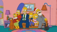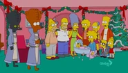 The complete Simpson family in their Christmas portrait in 2041. Abraham Simpson II is 113 and unfrozen, Homer is 69, Marge is 66, Lisa is 38, Zia is 13, Bart is 40, Maggie Simpson, Jr. (in a trolley) is a newborn, Maggie is 31, and Jiff and Skippy are 5.