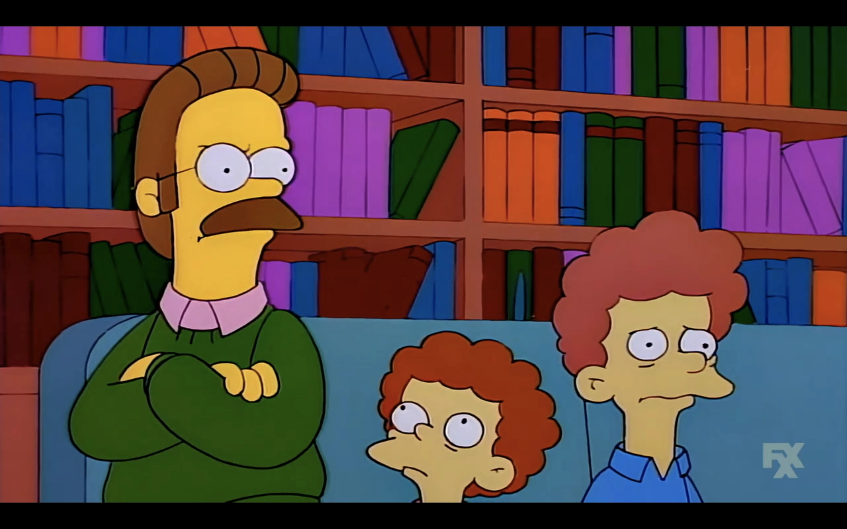 - When Ned is warning Rod and Todd not to poke each other with sharp objects like Itchy and Scratchy, his moustache is totally smooth for a frame.