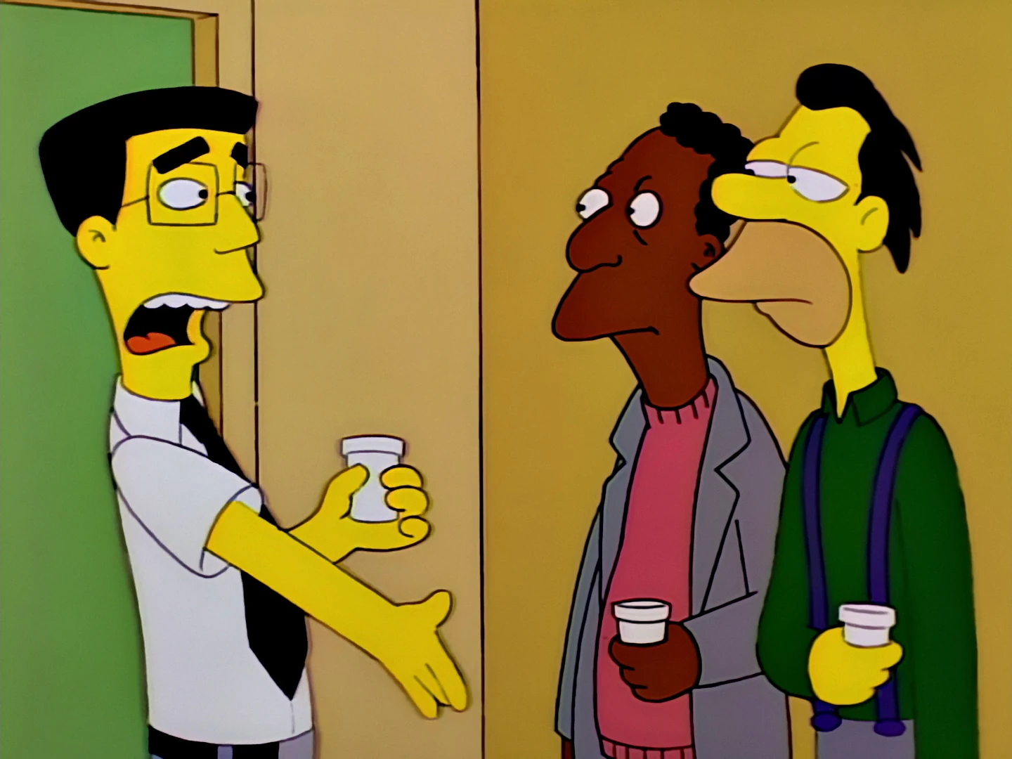 Grimes' dislike for Homer heats up as he furthers witness Homer's ineptitude and is horrified when he learns that Homer is the plant's safety inspector. When he brings this up to Lenny and Carl, they see his point but say not to think about it is best. When Homer accidentally almost drinks sulfuric acid, Grimes knocks the beaker out of his hand and ends up damaging the cafeteria wall, for which he then gets blamed for by Mr. Burns after Homer (without mentioning Grimes saving him or his own carelessness with the beaker) instantly points him out as responsible; Burns reprimands Grimes by decreasing his salary. Grimes approaches Homer, declaring his hatred of him and announces that from that moment on, the two of them are enemies.