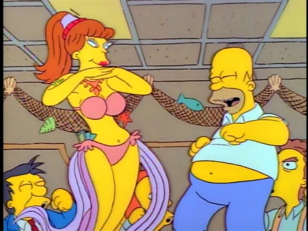 Later, Homer announces that he is going to a bachelor party for Eugene Fisk, his supervisor at the power plant (formerly, his assistant). Marge chooses to take the kids to the Rusty Barnacle, a seafood restaurant where Fisk's bachelor party is taking place (in a private room known as Davy Jones' Locker). Fisk and his father are uncomfortable and want to leave after a sexy belly dancer named Princess Kashmir arrives. When Kashmir is unable to arouse the Fisks, Homer is invited onstage to dance with her. Homer has a great time dancing with Kashmir. Bart later investigates the noisy party after stumbling upon it (he left the table because he began to feel sick after witnessing his order of squid with extra tentacles and was heading back after using the "buoys" room), observes Homer is onstage putting money in Kashmir's G-string and snaps a photo with his spy camera.