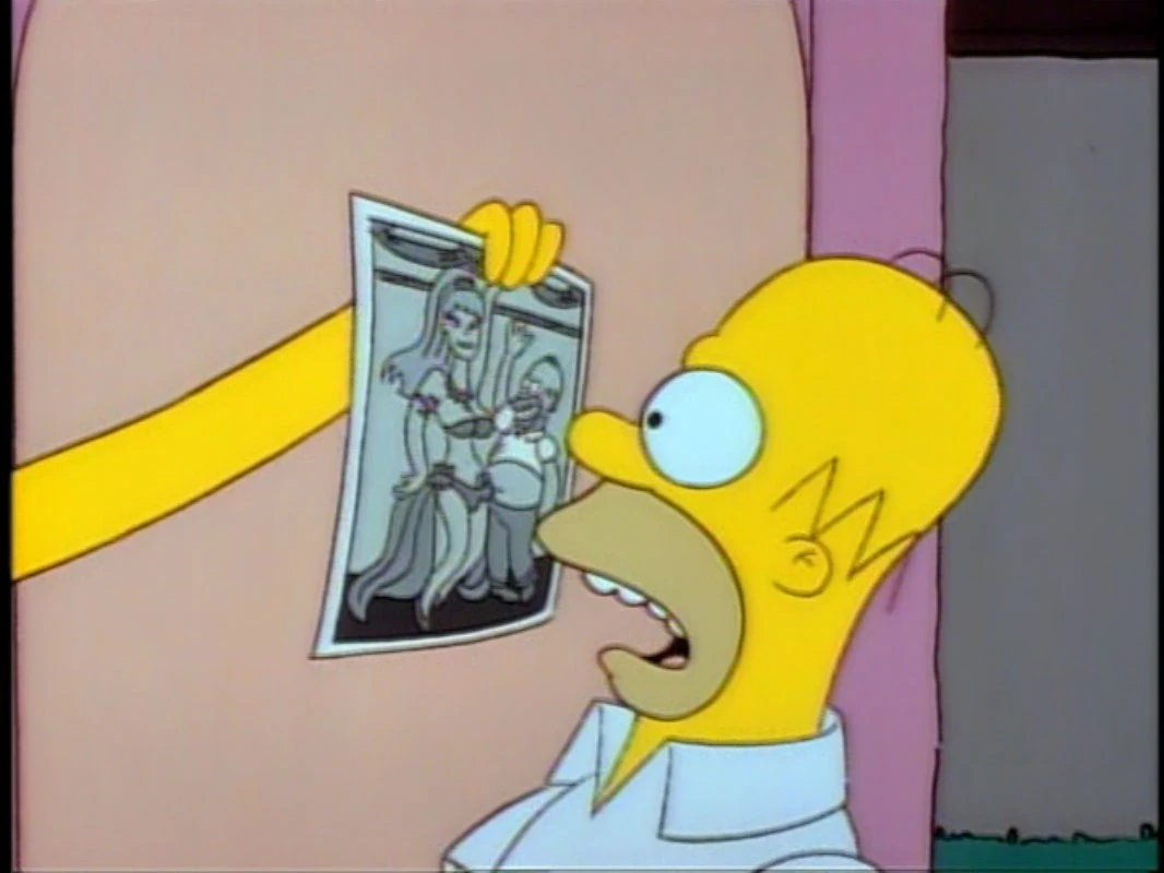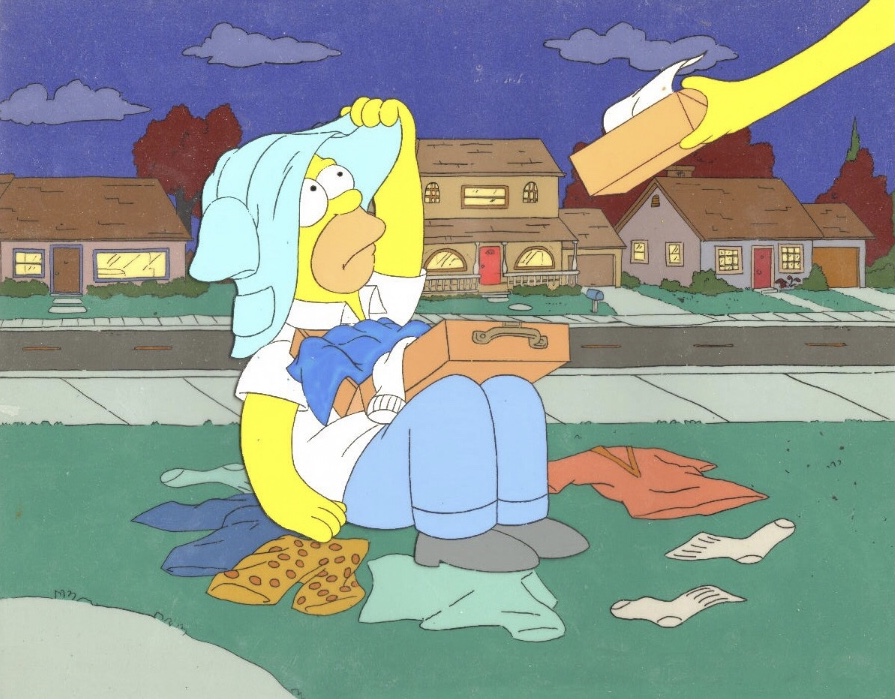 Later, Homer is on his way home from work, oblivious to what others are referring to when they make sly remarks about his sexual prowess, but when Homer opens the front door, Marge immediately shoves the picture in his face and demands an explanation. Bart admits he took the picture. Marge sends Bart to his room and, after scolding Homer, shoves a hastily half-packed suitcase his way and drives him out of the house.