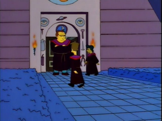 - The robe that the Stonecutter guard wore was the same standard burgundy color as all the other Stonecutters when Homer was peering out of the bush, but when Homer attempted to go through the doors, the guard's robe switched to black.