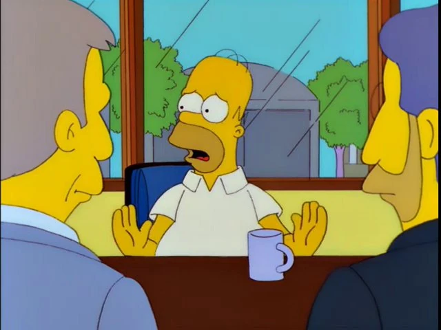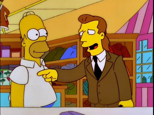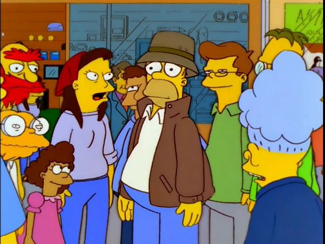 The next morning, Homer dejectedly wonders why the character was changed from his Cool Smooth Persona to the bumbling idiot from last night. Lisa tells him that the first episode was just a pilot, which the producers have fiddled with and changed. At work, all his colleagues prepare to watch him do something stupid and he does not disappoint, by spilling a fondue pot all over the control panel, shorting out the circuitry, and blacking out Albany. At the mall, people laugh at him and tease him as he walks by, even Chief Wiggum (who's cleaning out his ears with a loaded gun). To escape from all the humiliation, he tries hiding in the attic. Marge then approaches homer and told him that he should go to see the producers and convinced them to change his character back to his original pilot design.