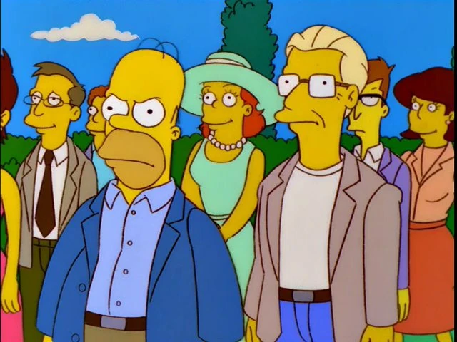 Due to Homer's new name as Max, all the negative attention fades away, much to his delight, though Marge is upset that he changed his name without consulting her. At work, Mr. Burns is impressed by the name and compliments Max, who decides to shop at Costington's to further improve his image. There, he meets Trent Steel and after a small chat, they go out to lunch, where Trent invites him and Marge to a garden party. Despite Marge's reservations, the two of them go to the party, where they meet a lot of famous people, like Woody Harrelson (who wears pants made entirely out of hemp), Bill Clinton (who attempts to seduce Marge), Lorne Michaels (whom the Simpsons pointedly ignore), and Ed Begley, Jr. Lindsey Naegle also makes an appearance here, albeit with red colored hair. Max finds out that the garden party is nothing more than an excuse to save a redwood forest from wanton destruction, much to his horror. All the guests (pushing a reluctant Max and Marge) board a "protest bus" and leave for the forest; Ed Begley, Jr. however outraces them in a vehicle powered by his own "sense of self-satisfaction."