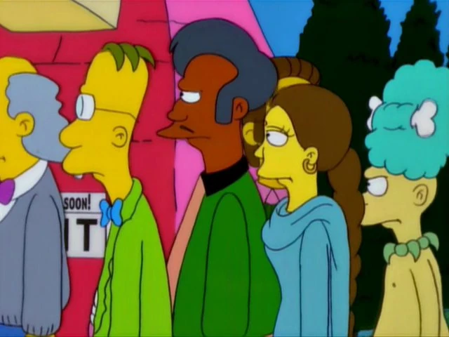 When the citizens are leaving the park in disappointment, Manjula, who is behind Apu, is yellow, has brown hair, and is wearing blue clothes.