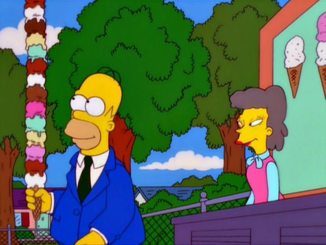After Helen Lovejoy makes a very tall stack of ice cream scoops on the cone, she is wearing lipstick.