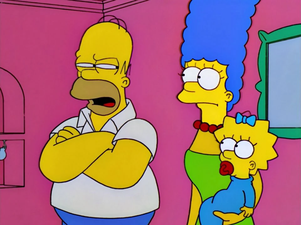 When Marge tells Homer that he should give up fatty foods, the top spike of Maggie's hair isn't colored in above her bow.