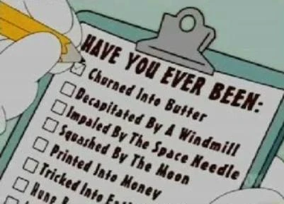 The medical questionnaire that Scratchy fills out asks "Have You Ever Been:", followed by a list of catastrophic events. Scratchy checks them all, because they've all happened to him in previous Itchy & Scratchy episodes: