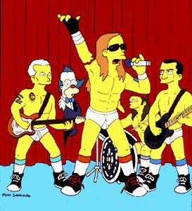 The show is a success, and later at Moe's Tavern, Bart makes a toast; "To Krusty... the greatest entertainer in the world! (Except Johnny Carson who's dancing while playing the accordion and balancing Jasper and Grampa on his head with a table, who think it's the bus to the civic center.)