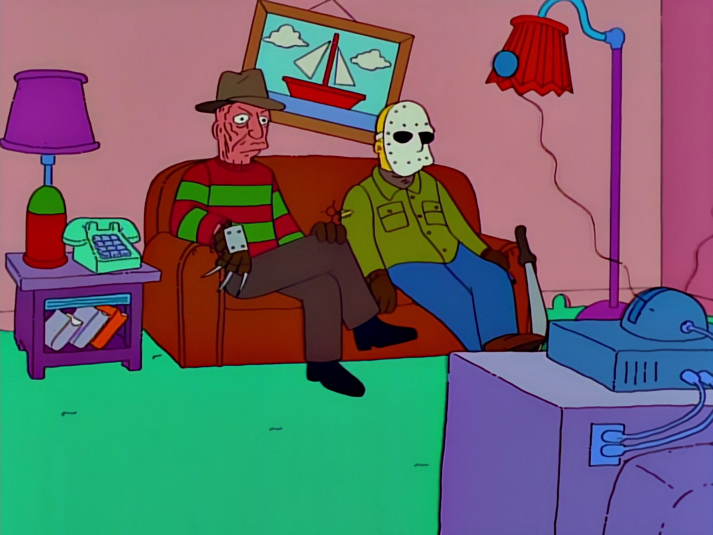 Instead of the Simpsons running into the living room and sitting down on the couch (since they all died in the driveway scene), Freddy Krueger and Jason Voorhees are already on the couch. An impatient Krueger asks where they are, but Voorhees shrugs it off and turns on the TV to watch anyway.
