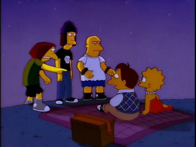 However, the influence of Nelson's friends – Jimbo, Dolph and Kearney – proves to win out when they convince Nelson to throw spoiled coleslaw that they found behind the dumpster from Krusty Burger at Principal Skinner's house. Skinner immediately fingers the boys as suspects, and they run away. Nelson takes refuge with Lisa, claiming innocence. Lisa believes him, until Nelson finally lets the cat out of the bag, before realizing that Nelson has been lying to her, and thinks that they should end their relationship for their sakes, to the joy of the jealous Milhouse, who has had a longtime crush on her.