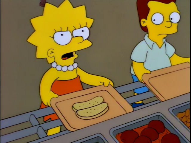The next day, at school, her newfound vegetarianism becomes a problem when she is almost forced to dissect a live worm whom she imagines pleading, "Li-i-isa, what did I ever do to you-u-u-u?". Lisa is a little confused ("Why does it talk like a lamb?"), but no less committed to her cause, so she refuses to dissect it, causing an independent thought alarm to be hit. At lunch, the only vegetarian option is a hot dog bun, which Lunchlady Doris proclaims "rich in bunly goodness". Lisa's caustic questioning of the exact point when Doris lost her enthusiasm for her job results in the second secret "independent thought alarm" she triggered that day, prompting Seymour Skinner to think that the students have become overstimulated. He orders Groundskeeper Willie to have all of the colored chalk removed from the classrooms, but he furiously rants that he warned them before because, in his opinion, the chalk had been "forged by Lucifer himself".