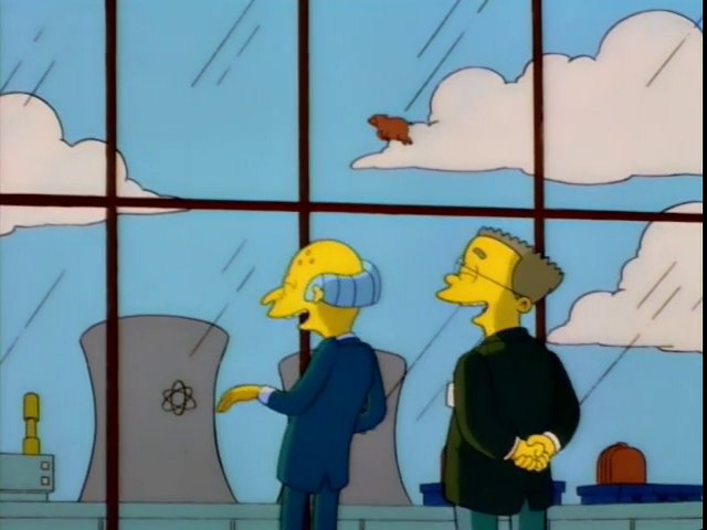Homer brings a roast pig for the party, but a furious Lisa climbs aboard a riding mower, and drives away with the roast pig in tow. Marge tries to stop Lisa, but yells, “Bart! No!” followed by, “Sorry, force of habit” when Bart reminds her it is Lisa who is misbehaving. Homer and Bart chase after Lisa and the pig, but she pushes the pig off of a slope before Homer and Bart can catch her. The pig rolls through bushes, into the river, and is shot into the air by a hydroelectric dam suction. While this is happening, the flying roasted pig passes by Mr. Burns' office at the Springfield Nuclear Power Plant, ironically just seconds after Burns admitted to Smithers of donating to a children's fund "when pigs fly".