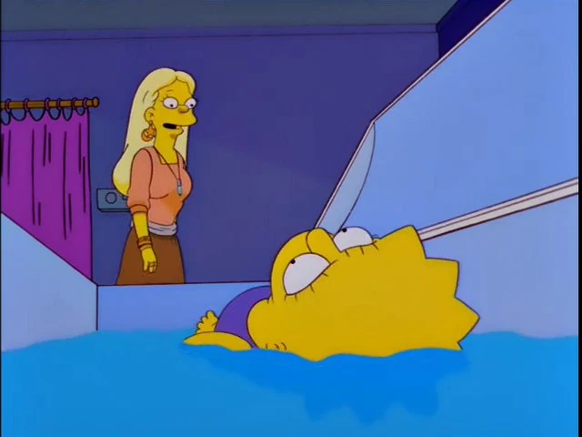 Now that her room is gone, Lisa is forced to stay in Bart's room, where he purposely drives her crazy. Even when Homer tries to bond with Lisa it only makes her more frustrated. After a while Lisa starts to get severe stomach aches caused by stress. Dr. Hibbert says he can give her harsh antacids, but feels that herbal tea might suit Lisa better. Lisa agrees until Homer buts in saying he won't let Lisa near the stuff and demands the antacids. After finally having too much of her father belittling everything she likes and believes, Lisa snaps at her him, claiming that just because he thinks what she likes is stupid and boring doesn't make that true but also goes onto say what he thinks is cool and fun isn't true either. Seeing this manner, Homer is saddened and Lisa feels bad for what she said, but says that even though they love each other very much they are just too different, and they will eventually grow apart. To get her cooled down, they visit a store run by a "hippie lady", who sells all different types of soothing items. She gives them some time in some isolation containers that will allow them to think. Lisa goes on a mental journey where she sees herself in the form of Snowball II, a tree and even Homer where she realizes that Homer really does try to be a good father and takes her lots of places he hates. Homer, however, is not thinking and his container is taken away by repo men who aren't willing to wait 'months' for the hippie lady's lease to expire. His container falls off the truck and the Flanders find it, believe it is a coffin and bury it. The tank breaks though the ground and ends up in the ocean and washes up on a beach, where Ralph Wiggum reports it to his dad. They bring it back to the store where they get out and reunite after her journey Lisa now understands that he is a good dad. Lisa and Homer then go to the monster truck rally to spend time together which Lisa enjoys, especially since she's with her dad.
