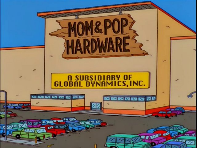 Mom & Pop Hardware (a property of Global Dynamics, Inc.) is a hardware store in Springfield. Its employees were "Pop" (the Squeaky-Voiced Teen) and "Mom", hence the name. Homer Simpson bought a barbecue pit from this shop.