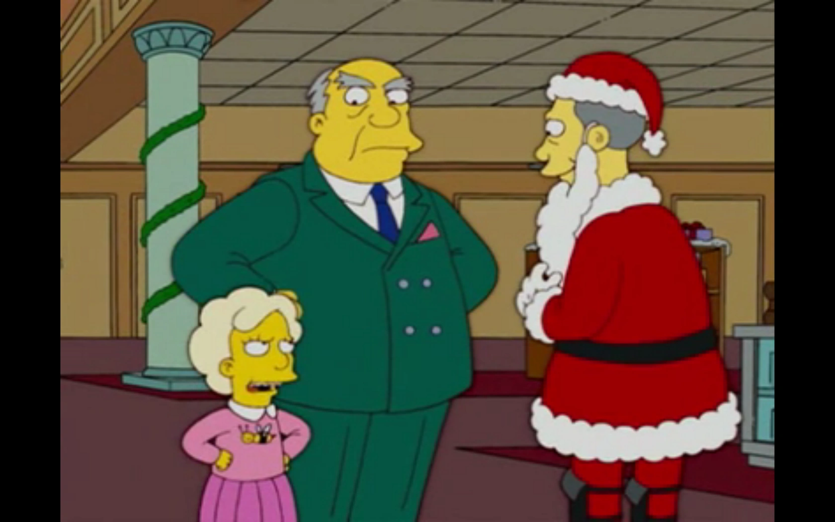 Many a Springfielder has worked for him. He usually says "Fireeeeeed!" or "Hireeeeeed!" when he wants to fire or hire someone, and sounds like he's yelling underwater when he does so. Homer has worked for him on three occasions: as the Thanksgiving Day Parade Santa Claus, as a mattress salesman, and as a model for a leading brand of jeans. He has also employed the The Yes Guy and Gil.