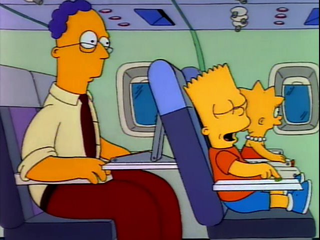 - When Bart is rocking his airplane chair back and forth, the part of the platform of the man behind Bart (specifically the part behind the laptop computer) turns from white to gray for a frame.