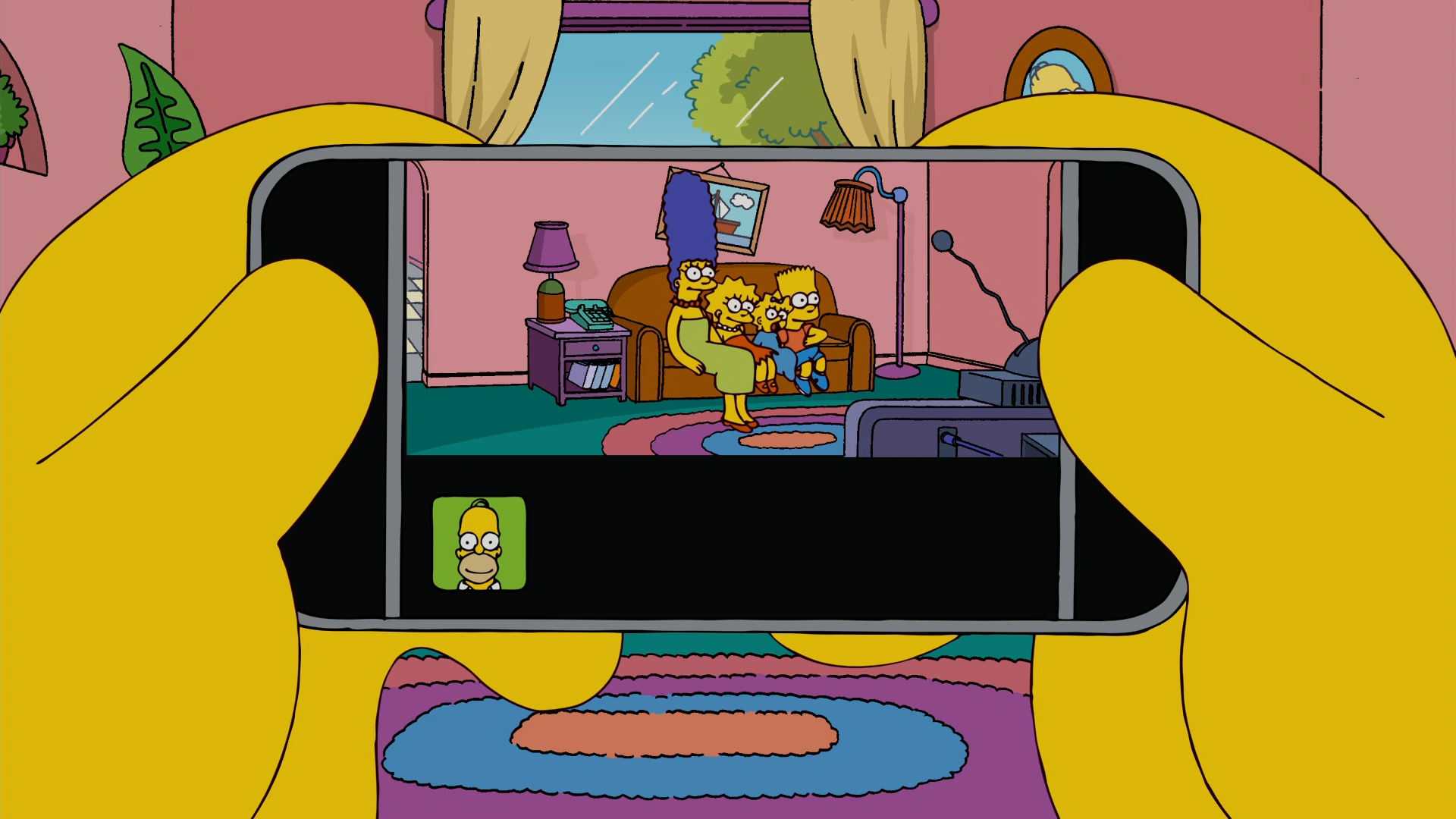Homer runs to the couch first. He pulls out his MyPhone, presses the "Couch Gag" app and downloads Bart, Lisa, Marge, and Maggie. When Homer gets an incoming call from Mr. Burns, he screams and swallows the phone.