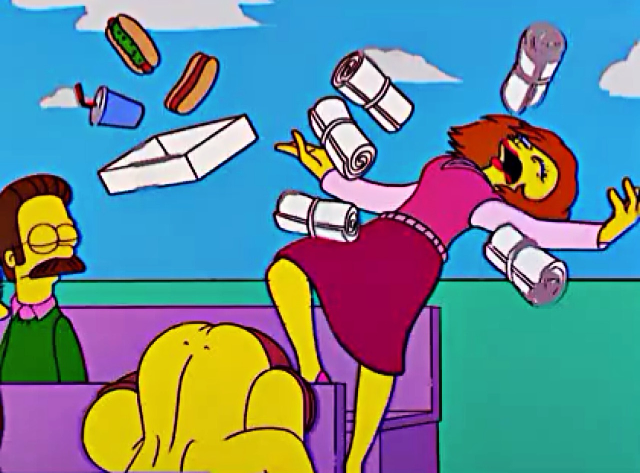 Despite his attempts at being a good Christian, as well as a good neighbor, most of his good deeds nevertheless end up exploited by the various Springfielders, and are often mocked by the townspeople behind his back for his naivety, zealousness, strict beliefs, and intolerance. This ultimately reached its breaking point when, after allowing two female college students to rent one of the rooms of his house for studying, they took advantage of his trusting nature and filmed a soft-core webcam site called "sexyslumberparty.com" without his knowledge. As soon as he learned of this from Homer, he angrily evicted them from his house, although the damage was already done when, thanks to Homer leaking the videos to the entire town, the townspeople arrive at his house around the time he evicted them to cheer on the girls, causing him to realize that the entire town actually mocked him behind his back, and he was even more shocked when he learned that Homer was the one who leaked the videos. He then entered a very deep depression due to this, and decided to have his family move temporarily to Humbleton, Pennsylvania where the Humbleton figurines that he collected were being made, and also posting a note stating that he left town.