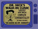 His degrees read "Mayo Clinic Correspondence School", "Club Med School", "Female Body Inspector" and "I went to medical school for four years and all I got was this lousy diploma" [6]. He frequently appears on infomercials, pitching all sorts of bizarre medical offers, and has often turned his operations into TV spectacles. He is also shown as an inventor/huckster (in the style of Ron Popeil) on the television show I Can't Believe They Invented It! His "Walk-In Clinic" is based at; 44 Bow Street. Its phone number is 555-NICK. He can also be called at 1-600-DOCTORB ("The B is for 'Bargain'").