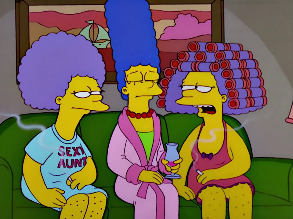 As children, Patty and Selma were apparently domineering towards Marge and ridiculed her ambition of becoming an astronaut, as well as assaulting her when she told them "No" which resulted in her having difficulty with telling anyone no. As children, Patty and Selma both were shown to have very melodic voices and sang very well. When Marge wanted their allowances, they gave them to her, but made Marge do their chores for them. With so much free time, the twins started smoking, causing their trademark rough voices.[35] Their relationship seems to have improved over the years. As adults, the Bouvier twins have a friendly relationship with their sister and frequently visit the Simpsons. They seem relatively fond of their nieces and nephew but seem to like them more when they were younger: "The older they get, the cuter they ain't." They have on occasion, watched the kids when their parents were out of town. However, Bart and Lisa would rather not be around when their aunts visit. Their idea of bonding with Lisa includes tutoring her in the belief that men are pigs, using Homer as the prime example.