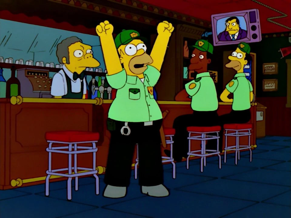 He plans to start a security company, SpringShield, to protect the town--as the police are now a joke to the townspeople. Homer enlists Lenny and Carl to accompany him, before long Springshield cleans up the town and are respected more than the Police themselves. Marge and the kids are very proud of Homer that they celebrate together. Mayor Quimby tries to insist he has faith in the police on TV but after walking into the station discovers Chief Wiggum trying to shoot a piñata with a shotgun, blindfolded instead of trying to work. The Mayor fires Wiggum right on the spot and in a blind rage turns all of the town's police duties over to Homer and SpringShield. They set up the station house as their new office and actually do the work.