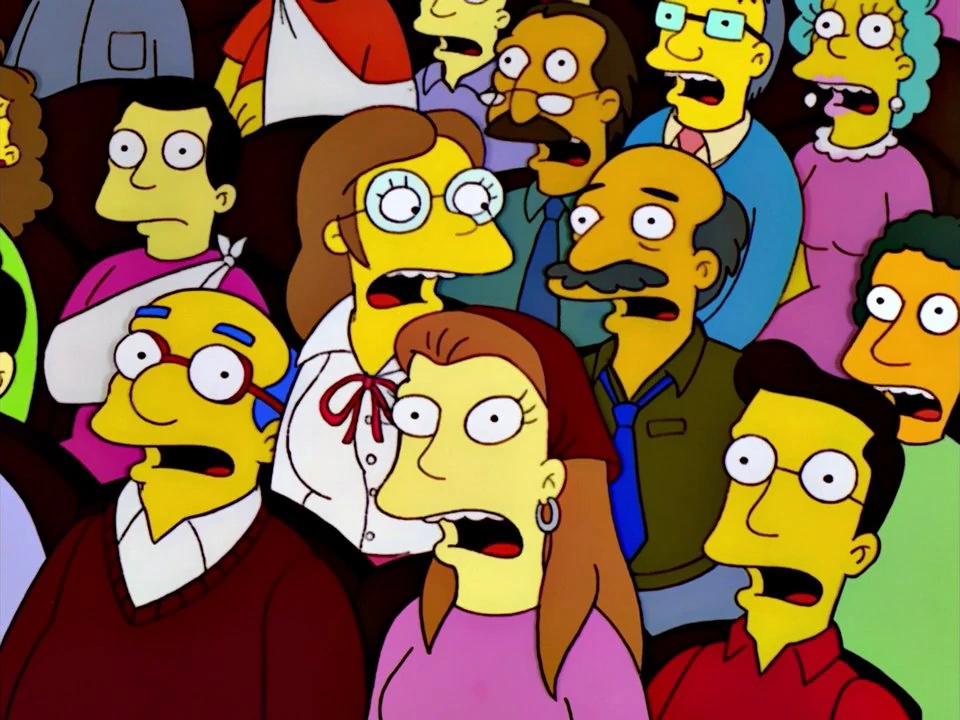 At the Springfield Town Hall, Ruth Powers has pale yellow skin and reddish-brown instead of her usual bright yellow skin and dark brown hair.