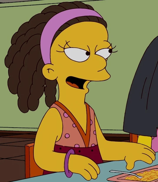 She wears a pink, red, and orange dress. She has red sandals and pink headband in her hair. Her hair is brown and she wears a purple bracelet on her wrist. Unlike most characters in the show, her skin complexion is tanned. In "Springfield Splendor", she was seen wearing pink socks and magenta and white sneakers.