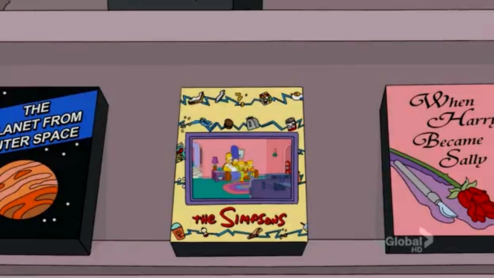 The family sits on the couch as usual. The camera zooms out to reveal that they're on the cover of a video, next to The Planet from Outer Space and When Harry Became Sally. The camera zooms out further to reveal that the videos are in an abandoned rental store that's being demolished.