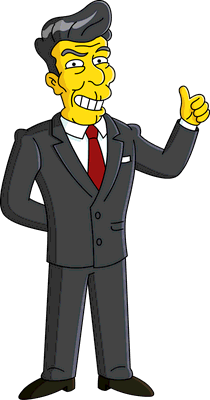 Reagan has been mentioned various times by the Simpsons. His first full appearance was at Mr. Burns' birthday party.[1] Reagan also appears in the parody montage of Homerland.[2] The Be Sharps performed for him and his wife Nancy Reagan at the Statue of Liberty.[3] He and the other living former presidents were offered to guest star in an episode. Yet he was the only one who responded by saying he did not want to.