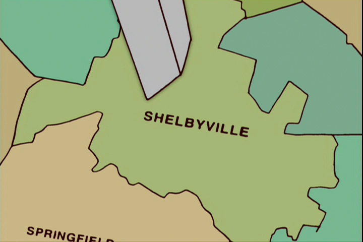 Shelbyville (allegedly formerly known as Morganville) is a town next to, and somewhat similar to, Springfield. They are treated as twin cities, though there is an intense rivalry between the two, dating back to their founders. Shelbyville is to the west of Springfield.[1] Despite the rivalry between the two, it shares many similarities with Springfield and its inhabitants.