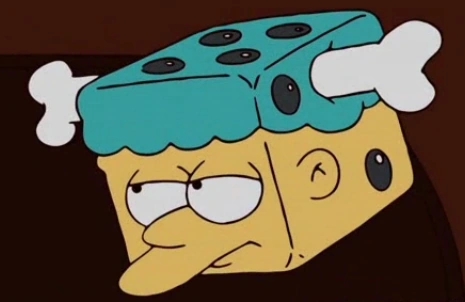 Aside from the bone, Mel has a light blue curly hair in a sort of the beehive-like style similar to Marge's, only shorter and rounded at the top. His hair also appears to be "fashioned/poised/set" in an upward position because it seems to sit atop his head, showing that he has no sideburns or even a hair "tail". Mel perpetually wears a bone in his hair—a kangaroo femur, gifted to him by Australian actor Yahoo Serious[5]—which may or may not be permanently affixed. He once warned Lisa not to use a bone to try and get gum out of her hair, as he did and it became permanently stuck there.[6] However, he has been seen removing the bone to use it as a weapon during a duel, and to whack at the dome under which Springfield was trapped by the EPA.[7] Bart also took the bone out of his hair to prank Martin Prince, after which Mel was shown to have long flowing hair. Homer also took the bone out of his hair and used it as a murdering weapon. He indicated that he could feel meteorological conditions in the bone, such as incoming storms.[8] Before he got his bone, Mel was famous in both London and Hollywood and was able to comb his hair.
