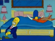 Marge jumps onto the bed, while Homer caresses his leg after hurting it.