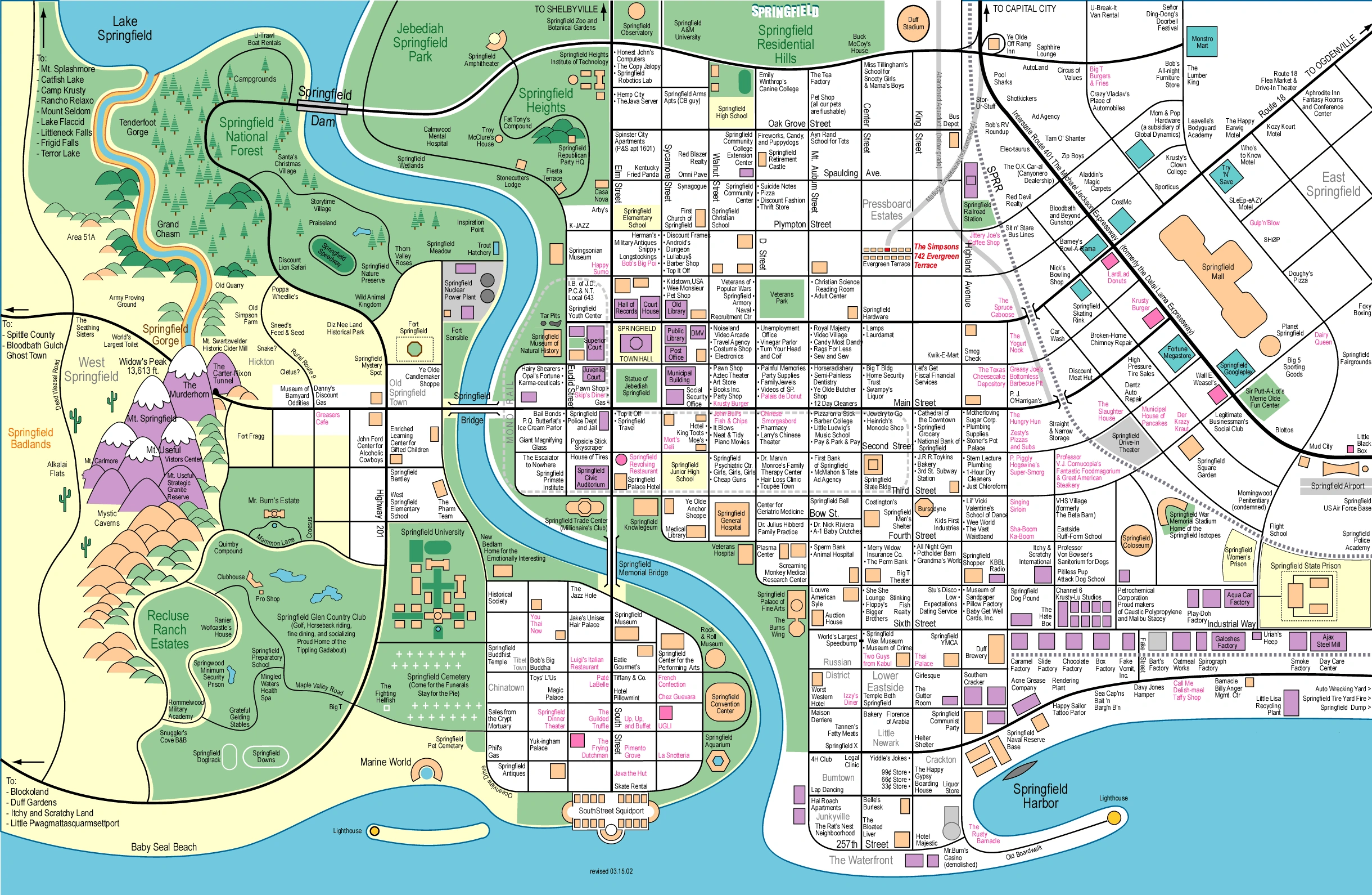 Founded in 1796 by Jebediah Springfield, a.k.a. Hans Sprungfeld, and a band of fiercely determined pioneers out of Maryland who set off after misinterpreting a passage in The Bible, Springfield seems to be a small city rather than a megalopolis. Its features include one nuclear power plant; at least five elementary schools; a minor league all-star baseball stadium; an airport; a harbor; a downtown district; a large tire yard (burning since 1966); a ghetto; a Russian District; its own Little Italy; several specialized shopping districts, Moe's Tavern, Barney's Bowl-A-Rama and a Chinatown.